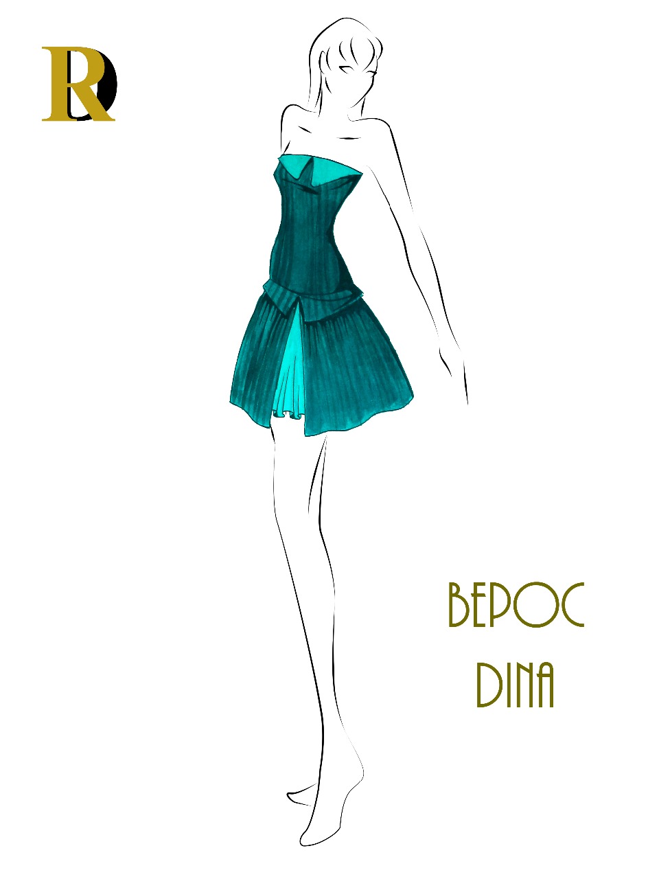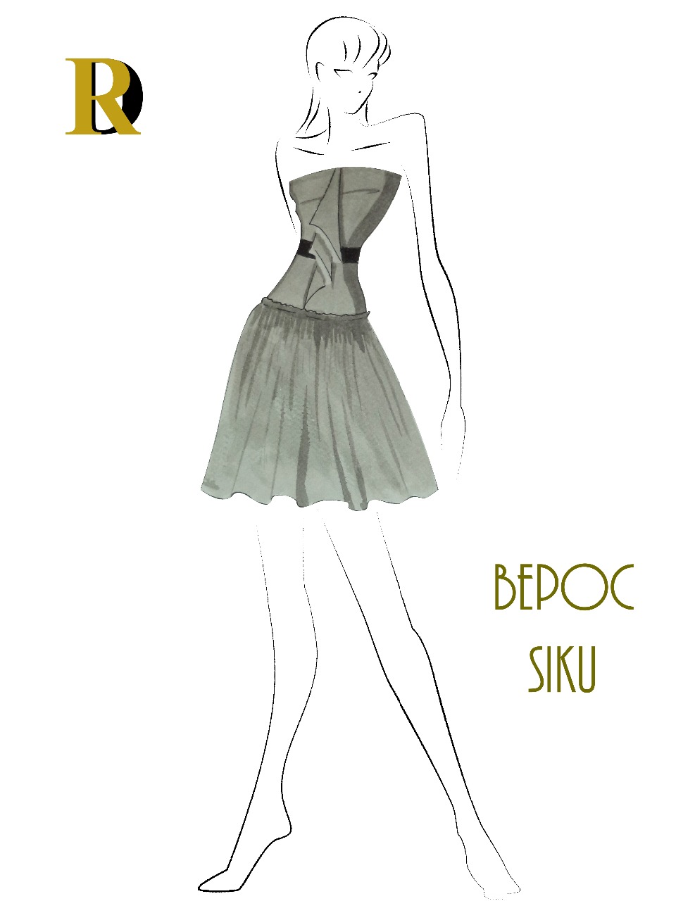Vestido entallado, con decoración en cintura y parte superior, abertura en la parte delantera en la que se muestra el forro, parte de la falda en tablas.